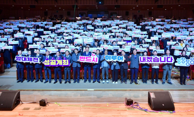 행사의 대미는 ‘성공대최 다짐 퍼포먼스’가 장식했다. 참석자들은 대공연장 뒤에서부터 무대 쪽으로 대형 공을 굴리며 성공 체전을 기원했다. 공이 무대까지 도달하자 현수막이 펼쳐지며 ‘2025 양대체전 성공 기원! 새로운 성장의 기회로’라는 메시지가 공개됐다. 참가자들은 메시지를 함께 외치며 체전 성공개최 의지를 되새겼다.