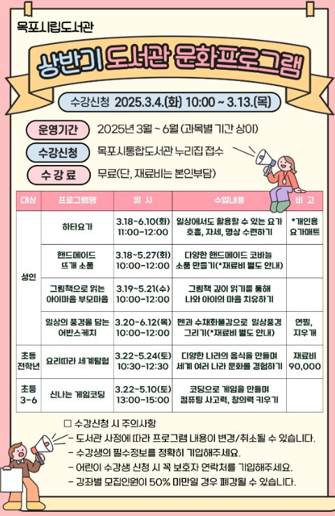수강 신청은 3월 4일부터 13일까지 목포시통합도서관 홈페이지에서 가능하며 모든 강좌는 무료(단, 재료비 본인 부담)다.