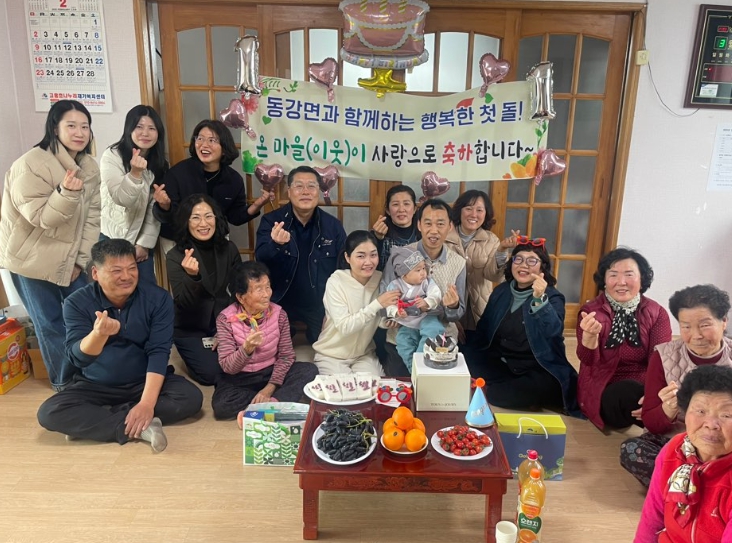 이날 마을 주민과 면사무소 직원들이 한자리에 모여 아기의 건강한 성장을 기원하며, 지역 특산품과 돌 떡, 축하 카드를 선물하는 뜻깊은 시간을 가졌다.