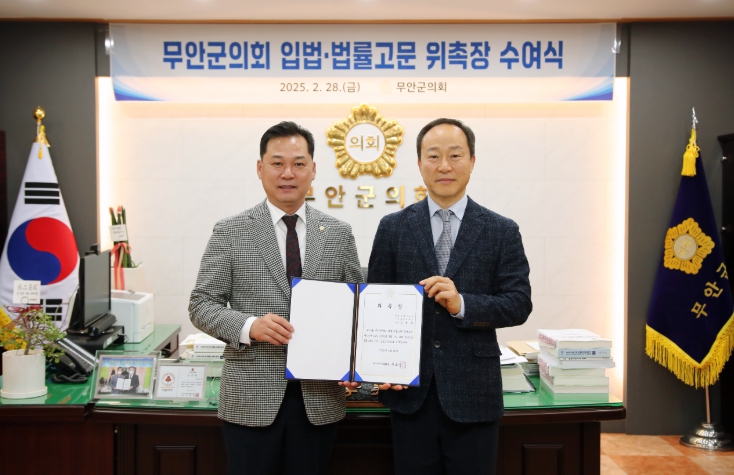 새로 위촉된 입법 고문은 김병도 소장(한국산업기술원 자치법규연구소), 홍봉주 변호사(H·P법률사무소)로 앞으로 무안군의회의 입법 활동 및 법률적 검토를 지원할 예정이다.
