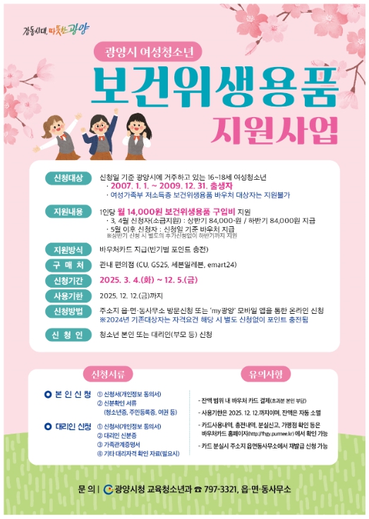 여성보건위생용품 지원사업에 대한 자세한 사항은 광양시 교육청소년과 또는 주소지 읍·면·동 사무소로 문의하면 된다.