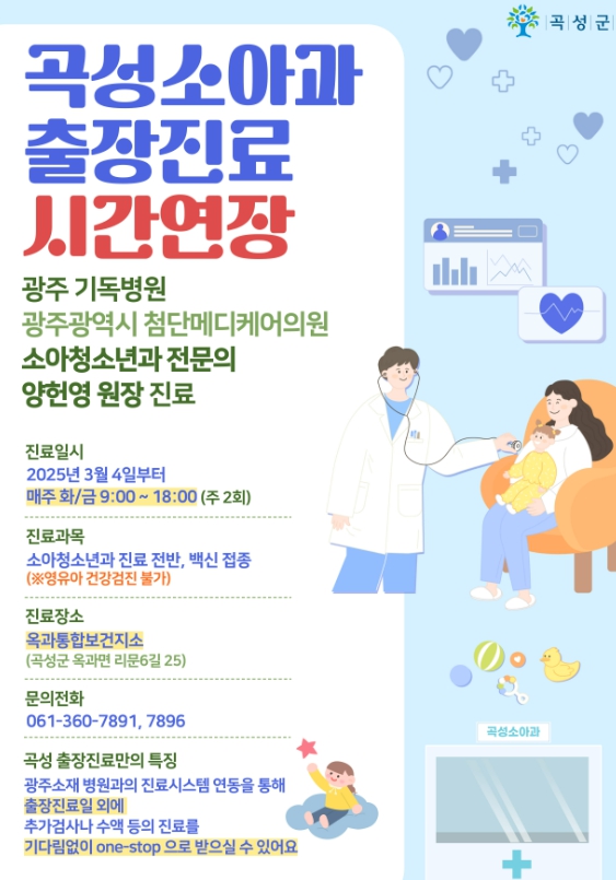 전남 곡성군은 3월 4일부터 옥과통합보건지소 소아청소년과 진료시간을 기존 9시~12시에서 9시~18시로 오후까지 연장하기로 했다.