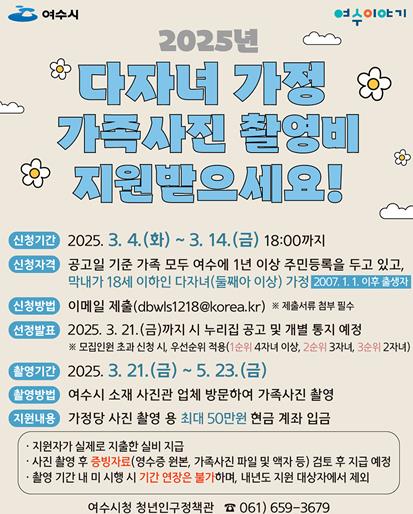 지원 대상은 3월 4일 기준 부모와 자녀 모두 여수에서 1년 이상 거주하고 있고, 막내가 18세 이하인 다자녀(둘째아 이상) 가정이다.