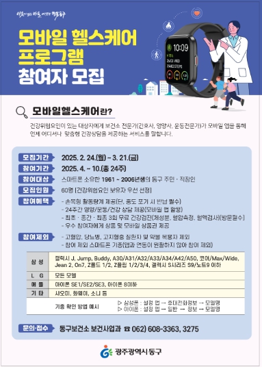사업 대상자로 선정되면 손목형 스마트워치가 제공되며 6개월 동안 건강검진과 맞춤형 건강상담을 받을 수 있다. 참여를 원하는 경우 동구 보건소 보건사업과로 문의·접수하면 된다.