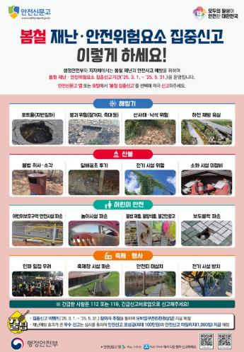 ‘안전신문고’는 국민 누구나 생활 주변의 재난ㆍ안전 위험 요소를 사진이나 동영상으로 촬영해 신고할 수 있는 시스템으로, 이번 집중 신고 기간에는 봄철 빈발하는 신고와 최근 이슈 등을 반영해 선정된 총 4개 유형을 운영한다.