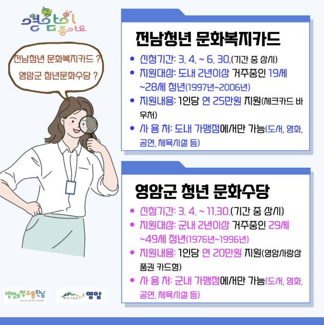 청년 문화복지비로 19~28세에게는 ‘전남 청년문화복지카드’ 25만원을, 29~49세에게는 ‘영암군 청년문화수당’ 지역화폐 20만원을 각각 지급하기로 한 것.