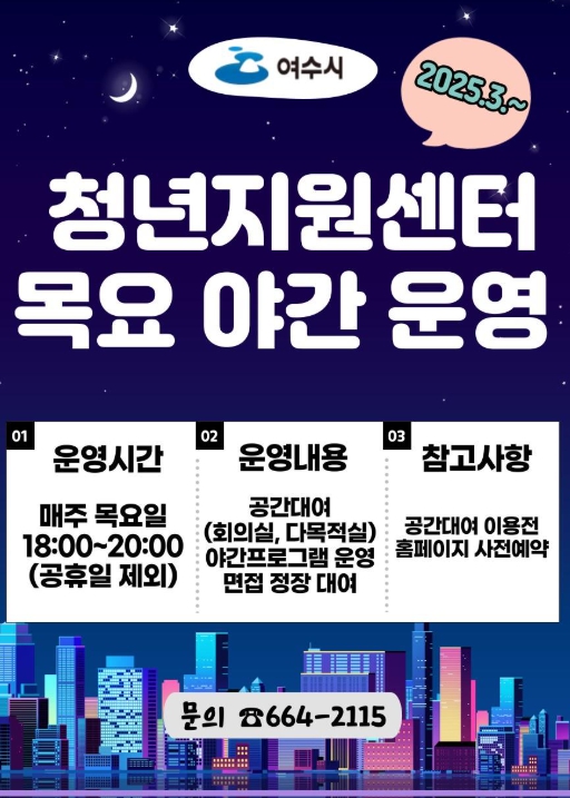 시 관계자는 “이번 목요 야간 운영 개시로 지역 청년들의 이용 편의가 증대되고, 서로 교류하는 기회도 많아질 것으로 기대한다”며 “청년들에게 더 많은 기회를 제공하도록 청년지원센터 활성화에 노력하겠다”고 말했다.