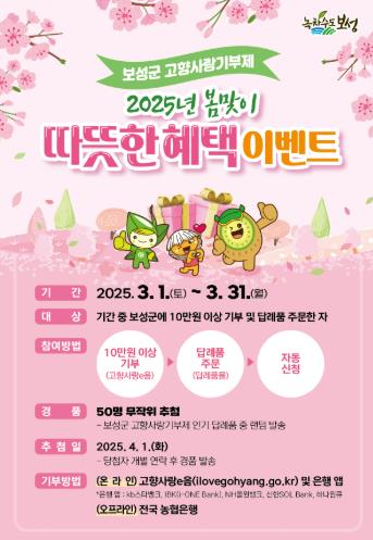이벤트 기간은 3월 31일까지며, 보성군에 10만 원 이상 기부하고 답례품을 주문한 기부자 중 50명을 추첨해 인기 답례품 중 1종을 추가로 증정한다.