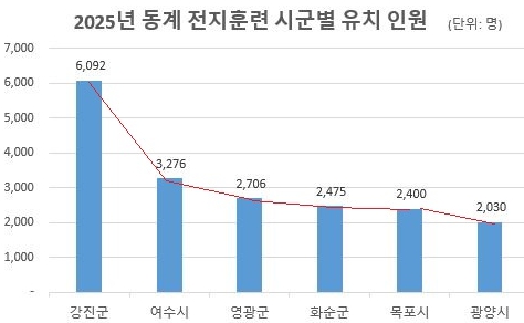 같은 기간 전남 전체 전지훈련팀 유치 규모는 1,580개 팀, 선수단 28,024명으로 이 가운데 강진군이 전체 선수단의 약 22%를 유치하며, 이를 통해 약 49억 3,000만 원의 경제 효과(인원 수 × 체류일수 × 1인당 1일 소비비용) 거둔 것으로 분석됐다.