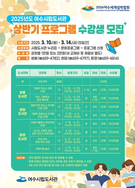 수강을 희망하는 시민은 여수시립도서관 누리집을 통해 신청하면 되며, 강좌별 수강료와 재료비는 별도 부담해야 한다.