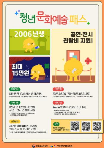 청년문화예술패스 사업은 사회에 첫 발을 내딛는 대한민국 19세(2006년 출생자) 청년들에게 연극·뮤지컬·클래식·콘서트 등 공연과 전시 관람비를 지원하는 사업이다.