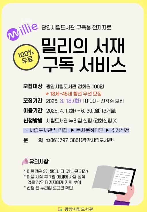 광양시립도서관은 선착순 100명에게 20만 권 이상의 전자책, 오디오북, 매거진 등을 제공하는 국내 최대 전자책 플랫폼인 ‘밀리의 서재’ 3개월 이용권을 제공할 예정이다.