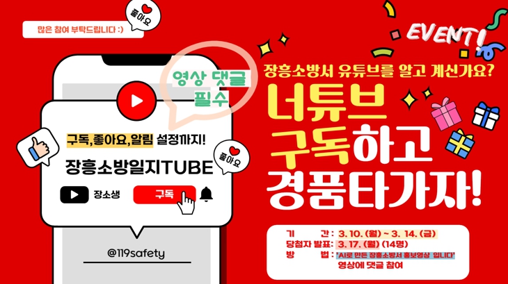 장흥소방서는 이 채널의 활성화를 위해 3월 14일까지 '구독 이벤트'를 진행한다고 밝혔다. 참여 방법은 간단하다. 장흥소방서 유튜브 채널을 구독한 후, 좋아요, 알림 설정, 영상 댓글(“AI로 만든 장흥소방서 홍보영상입니다” 영상 댓글 참여에 한함)을 남기면 자동으로 참여가 완료된다. 참여자 중 14명을 추첨하여 차량용 소화기를 증정할 예정이며, 당첨자는 3월 17일에 발표된다.
