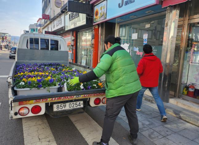 강진군은 강진읍 도심중에서도 군민들이 가장 많이 왕래하는 영랑로와 중앙로 일대를 중심으로 상가 입구와 주요 기관 등에 팬지, 비올라 화분 700여 개를 전시했다.