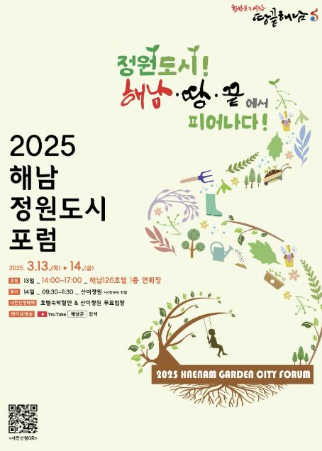 이번 포럼은‘정원도시, 해남·땅·끝에서 피어나다’를 주제로 산림청 및 전라남도, 정원 전문가 등의 강의 및 토론을 통하여 정원도시 해남의 정책 방향성과 정원문화 활성화 방안을 논의하는 자리로 마련된다.