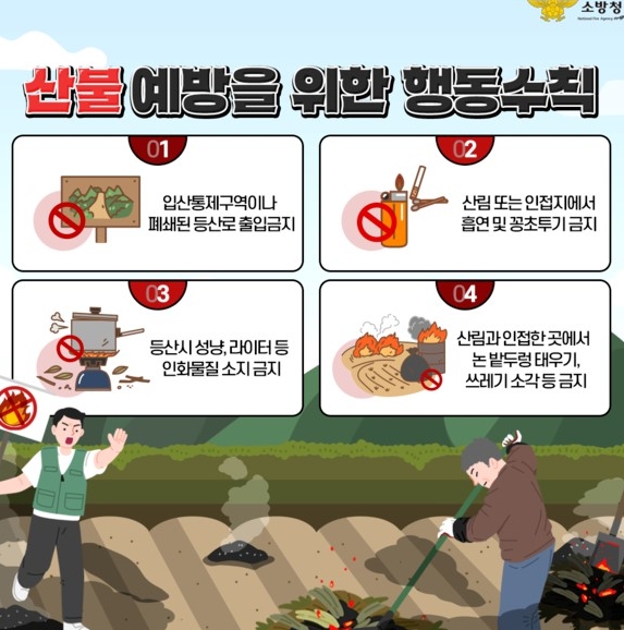 소방서에 따르면 겨울의 건조한 기후에 산림이 말라있는 상태를 지나 봄철에 접어들면 기온이 상승하며 산림의 상대습도는 낮아져 작은 불씨도 큰 산불로 확산될 수 있다. 이에 예방수칙의 준수가 필요하다