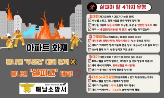 이에, 소방서에서는 주거 안정성을 높이고 인명피해를 저감하고자 △입주자 대상 화재 피난행동 요령 홍보 △관리자 대상 화재 피난 안전 매뉴얼 배포 △아파트 대피계획 세우기 홍보 등을 중점적으로 추진할 계획이다.