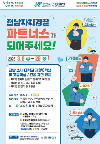 자치경찰에 관심이 많고 열정 있는 전남지역 대학생이나 고등학생이면 개인 또는 팀을 구성해 누구나 지원할 수 있다.