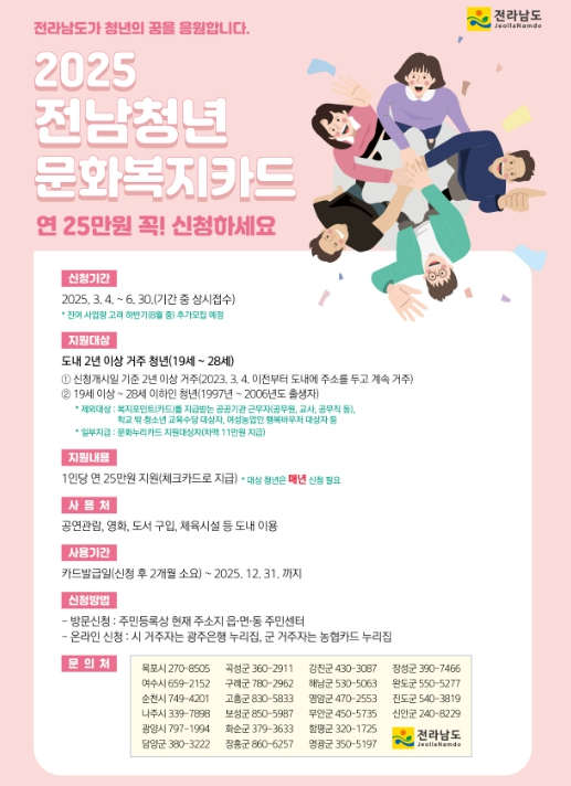 김명신 전남도 인구청년이민국장은 “청년 문화복지카드 사업이 청년의 문화·여가 활동을 활성화하고 지역 문화산업에도 긍정적 영향을 줄 것”이라며 “가맹점 등록 절차 개선으로 참여 업체의 편의성을 높이고 다양한 문화서비스가 원활하게 제공되도록 지원하겠다”고 말했다.