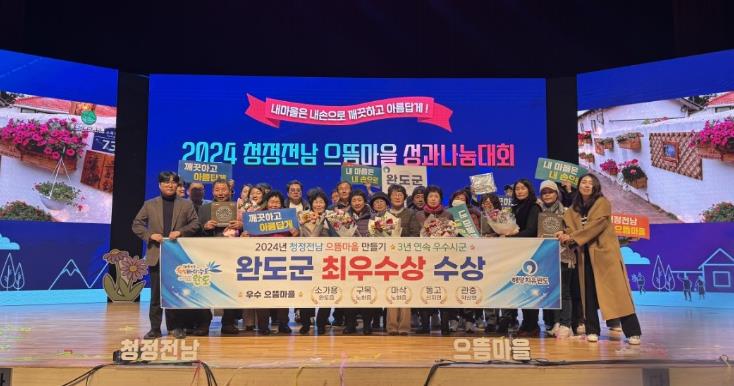 지난해에는 완도읍 소가용, 노화읍 구목·마삭, 신지면 동고, 약산면 관중 마을이 ‘우수 으뜸 마을’로 선정됐고, 2022년부터 2024년까지 3년 연속 우수 시군으로 선정됐다.