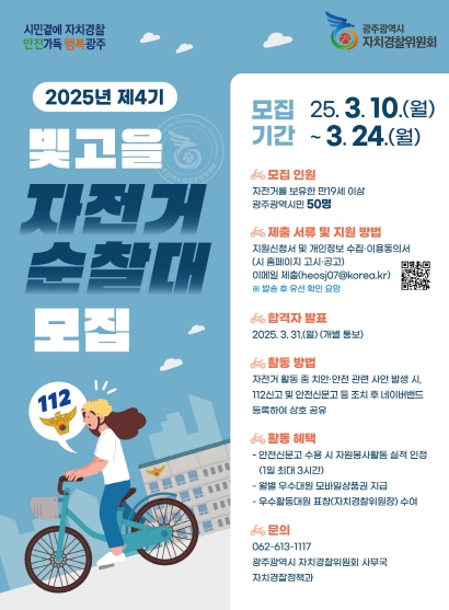 제4기 순찰대 모집 기간은 10일부터 24일까지며, 서류 심사를 거쳐 50명을 선발한다. 자전거를 보유하고 이를 이용한 활동이 가능한 19세 이상의 광주시민이면 누구나 지원할 수 있다. 지원자는 광주시 누리집 고시·공고 또는 광주자치경찰위원회 누리집에서 신청서를 내려받아 작성한 후 이메일로 제출하면 된다.