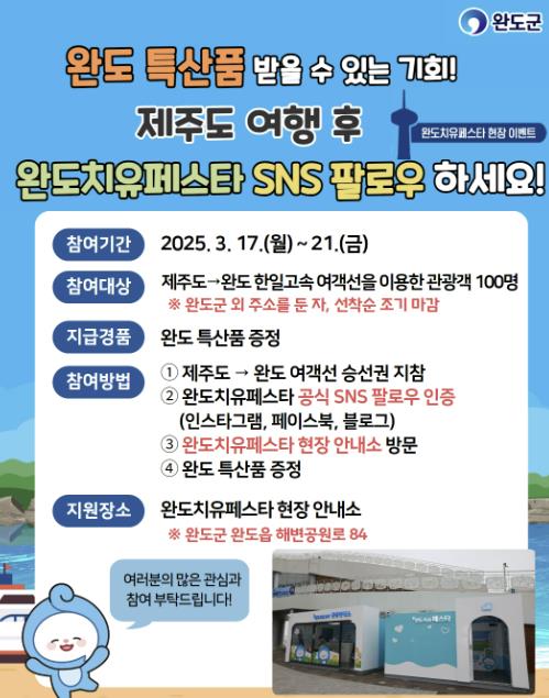 참여 방법은 ‘완도 치유 페스타’ 공식 SNS(인스타그램, 페이스북, 블로그)를 팔로우한 후, 제주도에서 완도행 여객선 승선권을 지참하여 완도 치유 페스타 현장 안내소를 방문하면 특산품을 받을 수 있다.