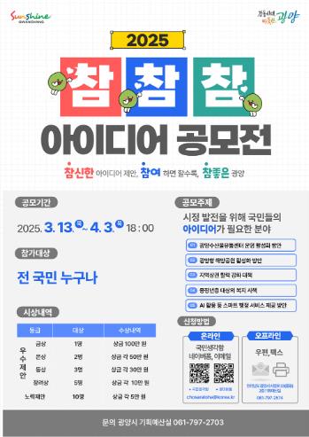 “참참참”은 ‘참신한 아이디어 제안, 참여하면 할수록, 참 좋은 광양’의 줄임말로, 시정 현안에 대한 시민들의 적극적인 제안 참여를 유도하고, 우수제안이 실제 정책으로 반영되는 과정을 통해 시정을 함께 발전시키자는 취지로 기획됐다.