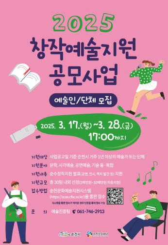 순천문화재단 관계자는 “창작예술지원사업은 지역예술인들에게 안정적인 창작 환경을 제공하여 지속적인 창작활동을 유도함으로써 지역 예술 생태계를 강화하고자 하는 사업이다”며 “이번 공모를 통해 역량 있는 지역예술인들의 다양한 창작물 창출로 시민 문화 예술 향유 기회가 확대되기를 바란다”고 말했다.