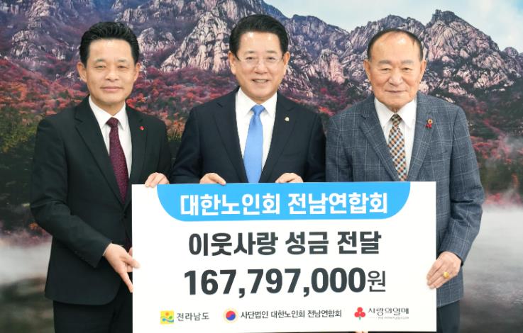정양수 대한노인회 전남연합회장은 “전남도에서 노인복지에 깊은 관심을 보여줘 항상 고맙게 생각한다”며 “앞으로도 지역사회를 위한 나눔 활동에 적극 동참하겠다”고 밝혔다.