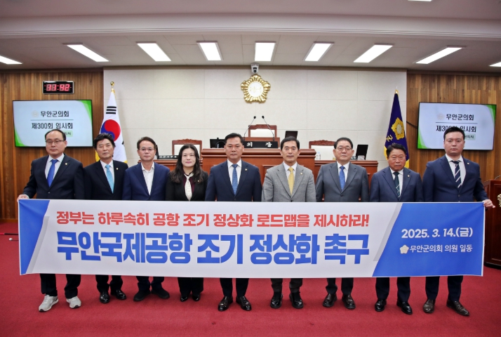 군의회는 마지막으로 임동현 의원이 대표발의 한 ‘무안국제공항 조기 정상화 촉구’ 건의안을 통해 무안국제공항 활성화와 지역경제 회복을 위해 정부에서 명확한 공항 정상화 로드맵을 제시할 것을 촉구했다.