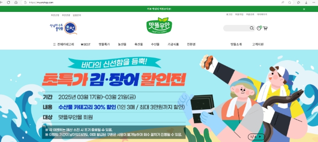 이번 기획전은 무안의 신선한 수산물을 더 많은 소비자에게 알리고, 지역 농수산물의 판매를 촉진하기 위해 마련했으며, 김·장어·돌자반을 대상으로 30% 할인 쿠폰을 1인당 3매씩 지급한다.