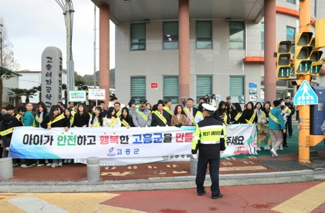 이번 캠페인은 어린이 등교 시간에 맞춰 고흥군, 고흥 경찰서, 고흥 소방서, 고흥군 교육지원청, 고흥여자중학교와 고흥동초등학교 학생 등 200여 명이 참여한 가운데 민관합동으로 진행됐다.