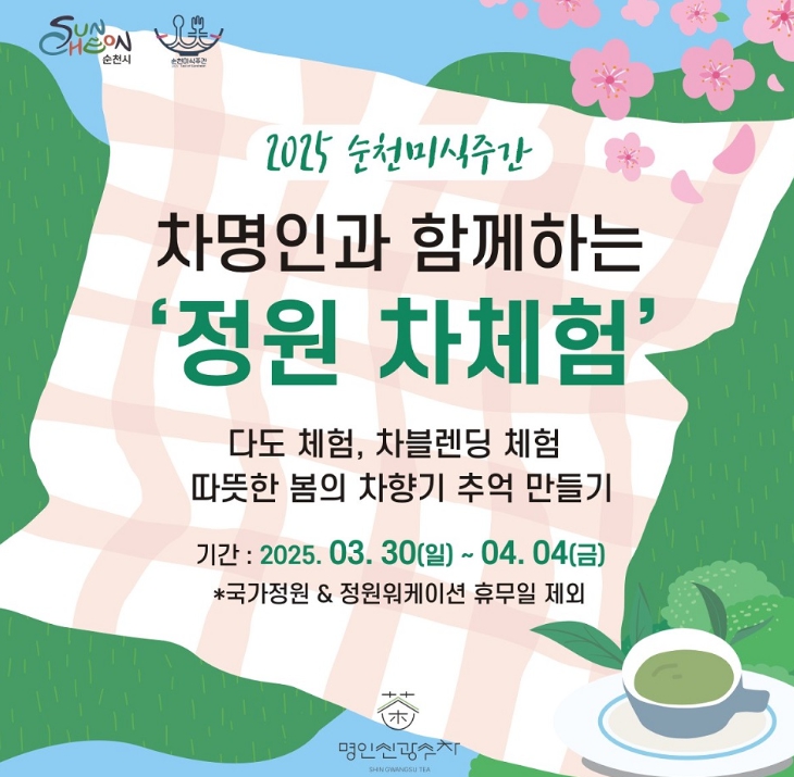 이번 차 체험은 식품명인 제18호 신광수 명인의 전수자인 신선미 대표가 진행하며, 미식주간인 3월 30일부터 4월 4일 동안 국가정원과 정원워케이션 에서 운영된다.