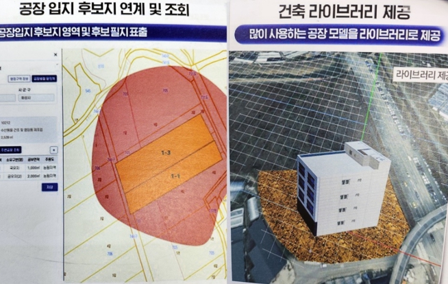 여기에 지도에서 원하는 업종과 입지를 선택해 사전진단을 클릭하면 디지털트윈 국토플랫폼(V-world)으로 자동 전환돼 2D·3D공간정보 기반으로 공장설립 분석 및 시뮬레이션 서비스를 제공한다.
