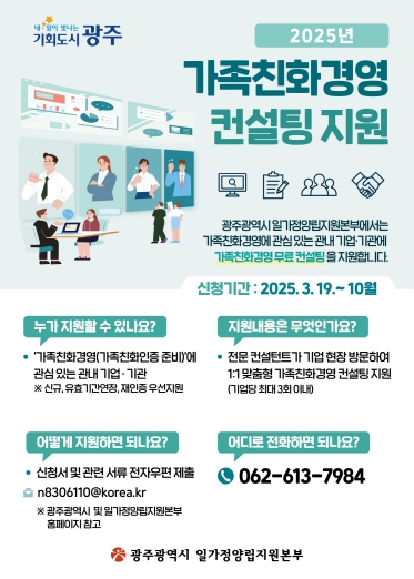 실제로 지난해 광주시 ‘가족친화경영 컨설팅’을 받은 19개 기업·기관 중 15곳이 가족친화인증 심사를 통과하는 등 컨설팅 효과를 톡톡히 봤다.