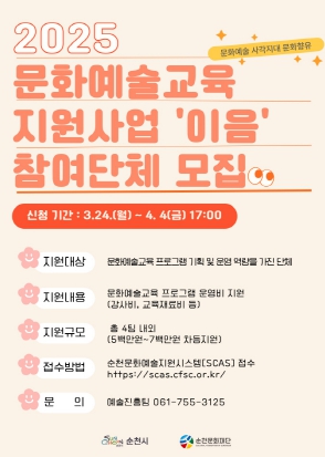 재단 관계자는 “이번 ‘이음’사업이 지역 내 문화예술교육 전문인력 양성과 문화예술 사각지대의 문화향유 기회 확대에 도움이 되기를 기대한다”며 “관내 예술단체의 많은 관심과 참여를 바란다”고 밝혔다.