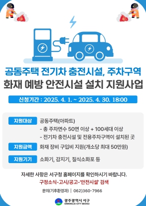 서구는 지난해 제정한 전기자동차 전용주차구역의 화재예방 및 안전시설 지원에 관한 조례가 본격 시행됨에 따라 감지기, 소화기, 질식 소화포 등 안전장비와 방재시설 설치 지원사업을 추진해 화재로 인한 피해를 최소화한다는 방침이다.