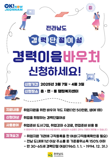 전남도에서는 경력단절 여성의 취업 지원을 위해 1단계 경력이음 바우처, 2단계 전남여성 경력채움 인턴십, 3단계 새일여성인턴 사업 등 전남형 3단계 경력단절 여성 일자리 지원사업을 추진 중이다.