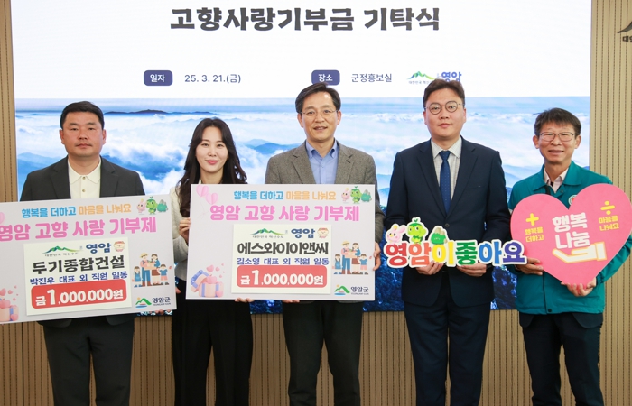 같은 날 영암 삼호읍의 에스와이이앤씨, ㈜두기종합건설 임직원들도 영암군을 찾아 각각 100만원씩을 기부했다.
