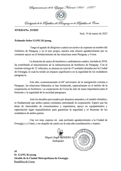 로메로 주한 파라과이 대사는 서한문에서 “파라과이 정부를 대표해 파라과이와 한국 간 우호적 관계 증진을 위해 지속적인 관심과 아낌없는 지원을 해주신 시장님께 깊은 감사의 인사를 드린다”며 “광주시의 협력은 파라과이 시민들의 안전을 지키는데 중요한 역할을 하며 양국 간 협력의 중요한 사례로 자리잡고 있다”고 밝혔다.