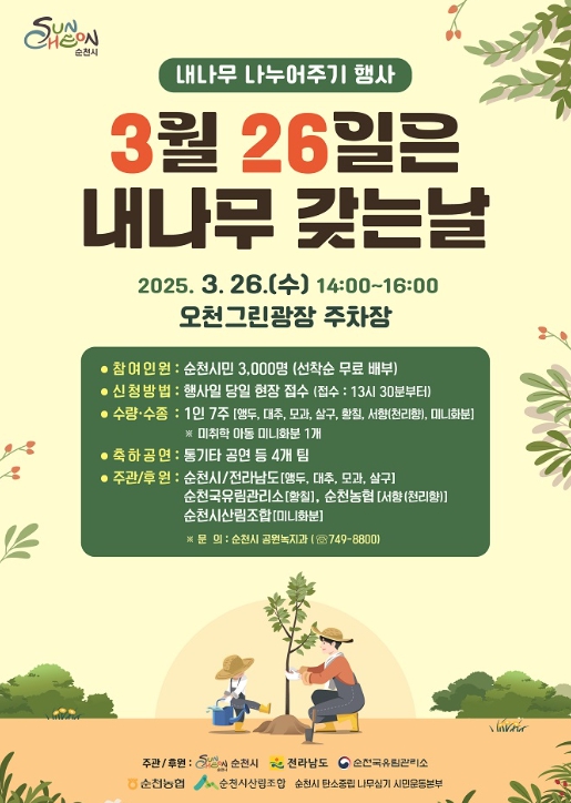 전라남도, 순천국유림관리소, 순천농협, 순천시산림조합과 협력하여 과실수 및 조경수, 미니화분 등 총 21,000주의 묘목이 준비되며, 행사 당일 현장 방문 접수를 통해 선착순으로 순천시민 3,000명에게 1인당 7주씩 무료로 배부될 예정이다.