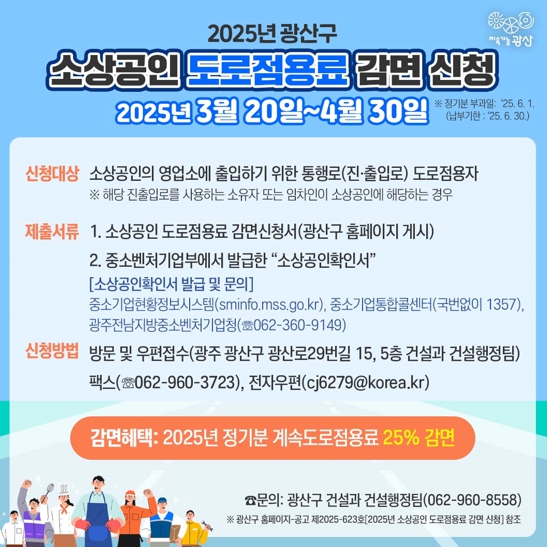 소상공인 도로점용료 감면 신청 및 정기분 도로점용료 부과에 대한 자세한 사항은 광산구 건설과 건설행정팀)으로 문의하면 된다.