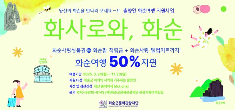 ‘화사로와’는 화순을 다시 찾은 출향인들에게 여행경비의 50%를 화순사랑상품권 또는 화순팜 쿠폰으로 돌려주는 방식의 출향인 화순여행 지원사업이다.