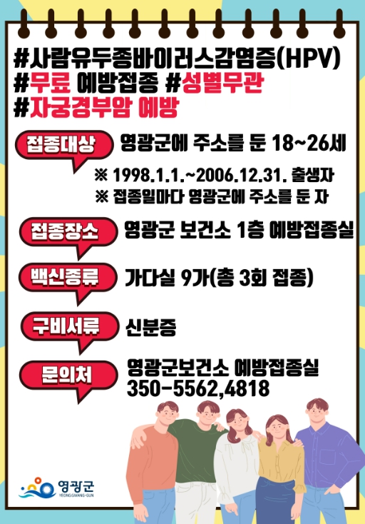 사람유두종바이러스 예방접종 희망자는 신분증 지참 후 영광군 보건소 1층 예방접종실(오전 09:00 부터 11:30) 방문하면 된다.