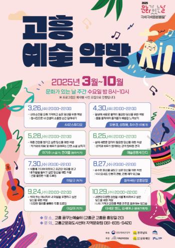 군은 문화도시센터를 수행기관으로 지정하고, 3월부터 10월까지 매월 마지막 주 수요일 고흥 꿈꾸는예술터에서 ‘다양한 장르의 예술로 마음을 치유한다’는 컨셉으로 ‘예술약방’ 프로그램을 진행한다.