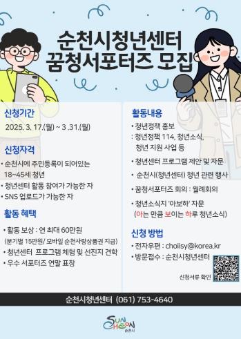 꿈청서포터즈는 순천시청년센터와 함께 SNS를 통한 청년정책 홍보, 다양한 청년 활동 참여, 모바일 청년 소식지 제작, 청년센터 프로그램 제안 및 의견수렴 등에 참여할 예정이다.