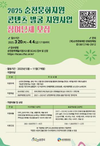 재단 관계자는 “이번 공모사업을 통해 순천의 고유한 이야기가 발굴되고, 이를 기반으로 다양한 형태의 문화예술 콘텐츠로 발전하여 지역문화의 깊이와 가치를 확장해 나갈 수 있기를 바란다”고 전했다.