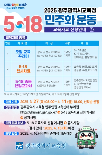 시교육청은 광주를 포함해 전국 학교를 대상으로 희망 신청을 받아 오월 교육 꾸러미 200개교, 5·18 전시자료 200개교, 5·18중등인정교과서 50개교 등에 선착순 배부한다. 자료는 중복 신청할 수 있다.