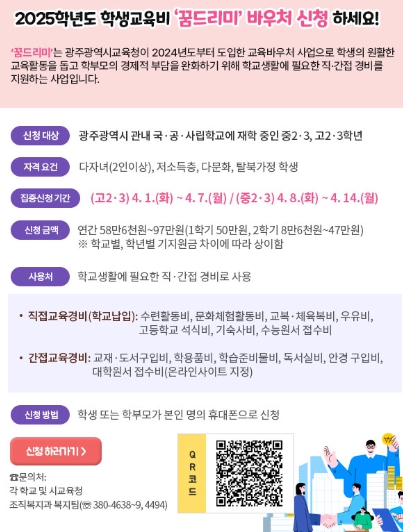 신청은 학생·학부모가 본인 명의 휴대전화로 QR코드 또는 URL을 통해 ‘꿈드리미 바우처시스템’에 접속해 정보를 입력하면 된다.