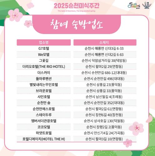 시 관계자는 “순천은 어디를 가든 맛집이다. 순천에서 머물면서 순천의 맛을 즐기고, 기념품도 받아가시길 바란다”고 전했다.